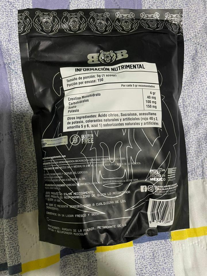 Creatina monohidratada marca "BlackBear Supplements" de 750gr para 150servicios x 40usd
