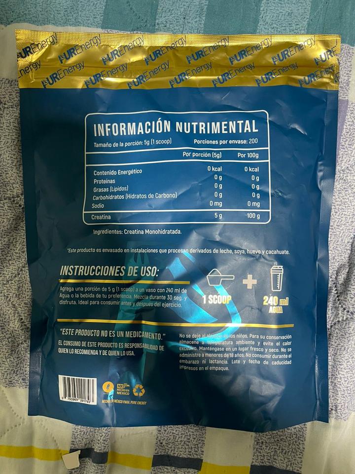 Creatina monohidratada marca "PurEnergy" de 1kg para 200servicios x 45usd